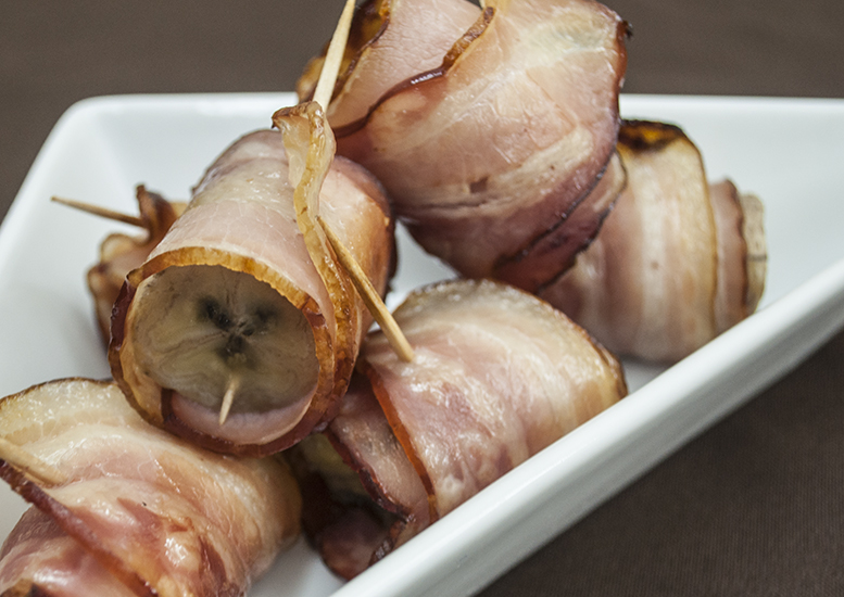 Roll each piece of banana in a slice of bacon and secure with a toothpick.