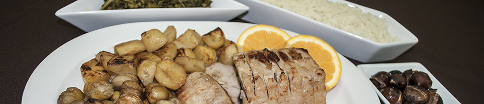 Cut onions into slices place in bottom of a baking dish. Place the fillet on the pork chop onions with the tip of a knife to entrench best seasoning and place on top. Sprinkle with olive oil. Add the peeled potatoes and bake at 175 degrees for 01.30h. Halfway through roasting, add the chestnuts.