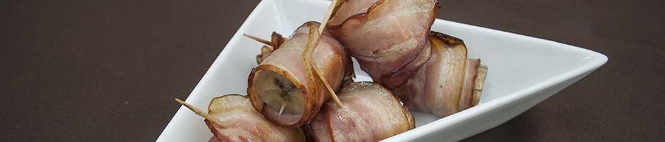 Enrole cada bocado de banana numa fatia de bacon e prenda com um palito.