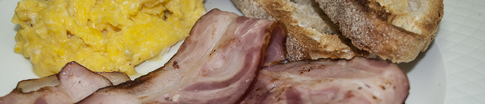 Sirva os ovos e o bacon quente, com fatias de pão torrado.